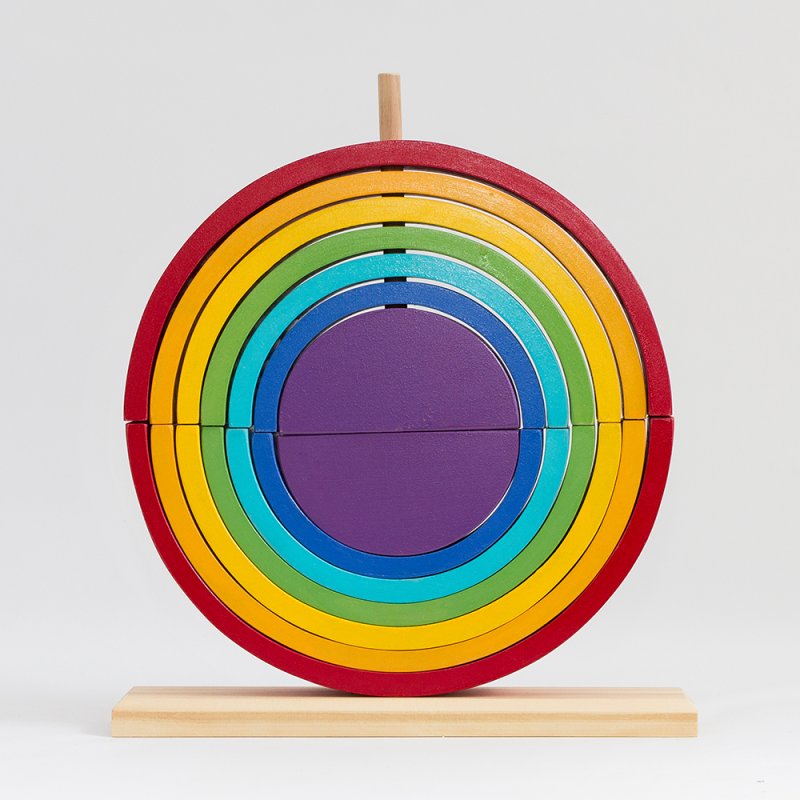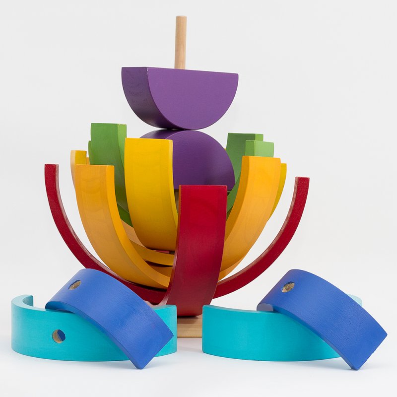 Su madera, imperfecta y natural, les da información sensorial muy valiosa. Sus piezas les ayudan a diferenciar formas y colores. Manipulándolo ganan destreza y coordinación. A través de él van comprendiendo conceptos complejos como el equilibrio, la simetría y la resistencia. Les abre la puerta de par en par al juego simbólico, a construir escenarios e imitar situaciones de la vida real.